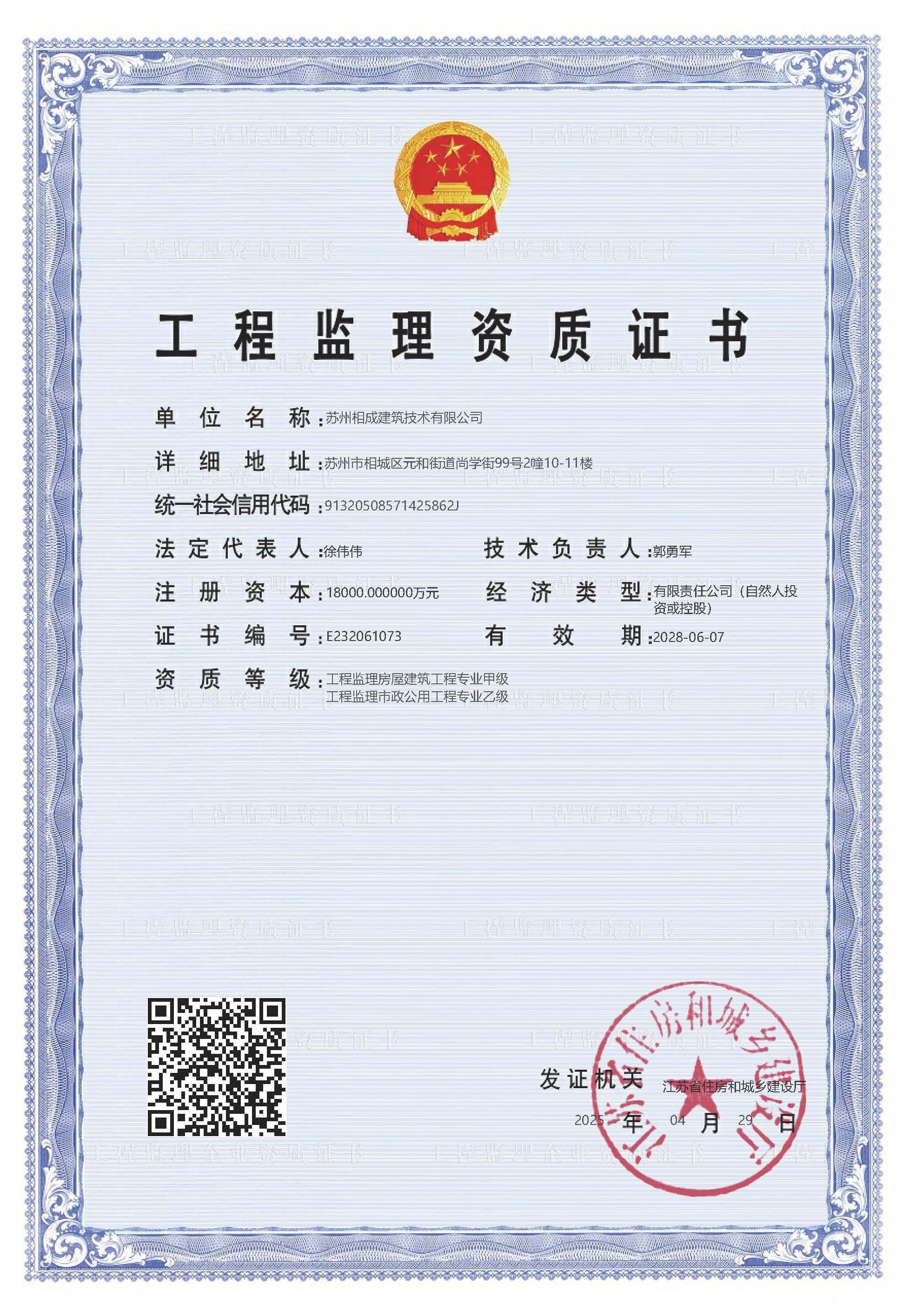 蘇州相成建筑技術(shù)有限公司是一家以提供建筑開發(fā)服務(wù)為主的建筑企業(yè),公司位于蘇州市相城區(qū),成立于2011年3月,注冊資本 10000萬,歷經(jīng)13年的努力于2022年7月獲省住建廳頒發(fā)房屋建筑工程施工總承包壹級資質(zhì),市政公用、建筑裝飾、地基基礎(chǔ)、消防設(shè)施、鋼結(jié)構(gòu)工程等專業(yè)承包二級資質(zhì); 2023 年6月份增設(shè)房屋建筑工程監(jiān)理甲級、市政一級監(jiān)理資質(zhì);目前是相城區(qū)唯一一家集施工總承包一級和建筑工程監(jiān)理甲級資質(zhì)的企業(yè)。
